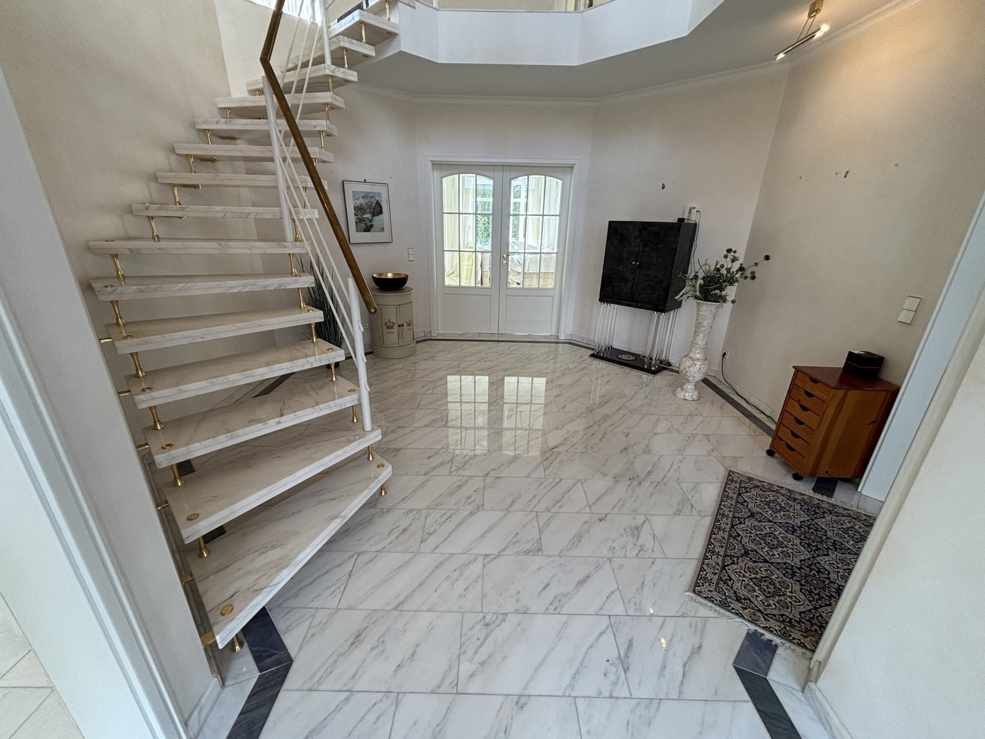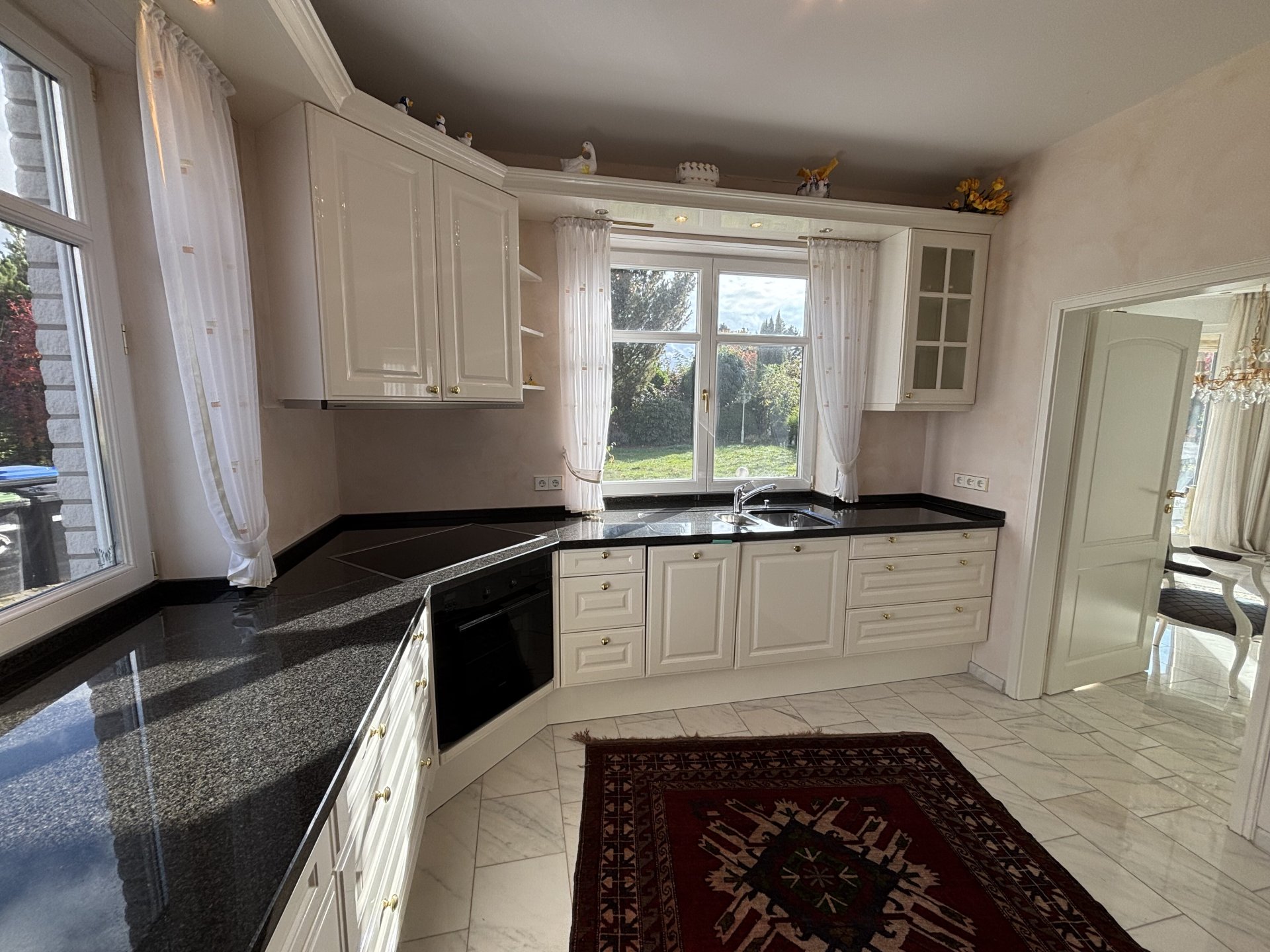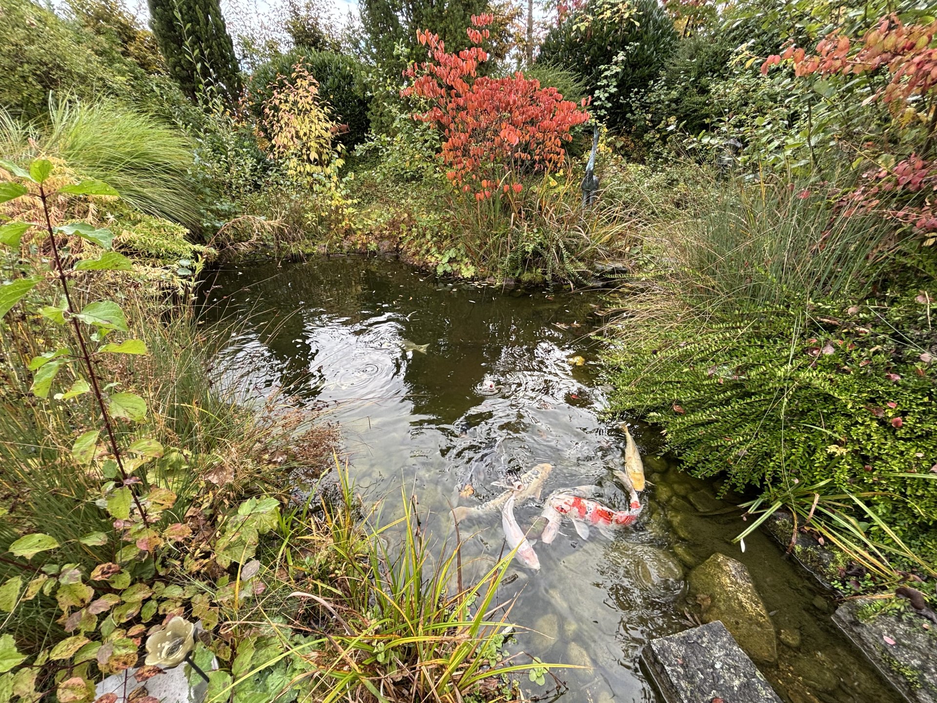 Der weitestgehend uneinsehbare Garten bietet Raum zur Entspannung und Privatsphäre. Eine Gartenhütte mit Reetdach sowie ein Koi-Teich runden die schöne Gartenanlage ab. Auf dem großzügigen Balkon mit Weitblick lassen sich Sonnenuntergänge entspannt bei einem Glas Wein genießen.