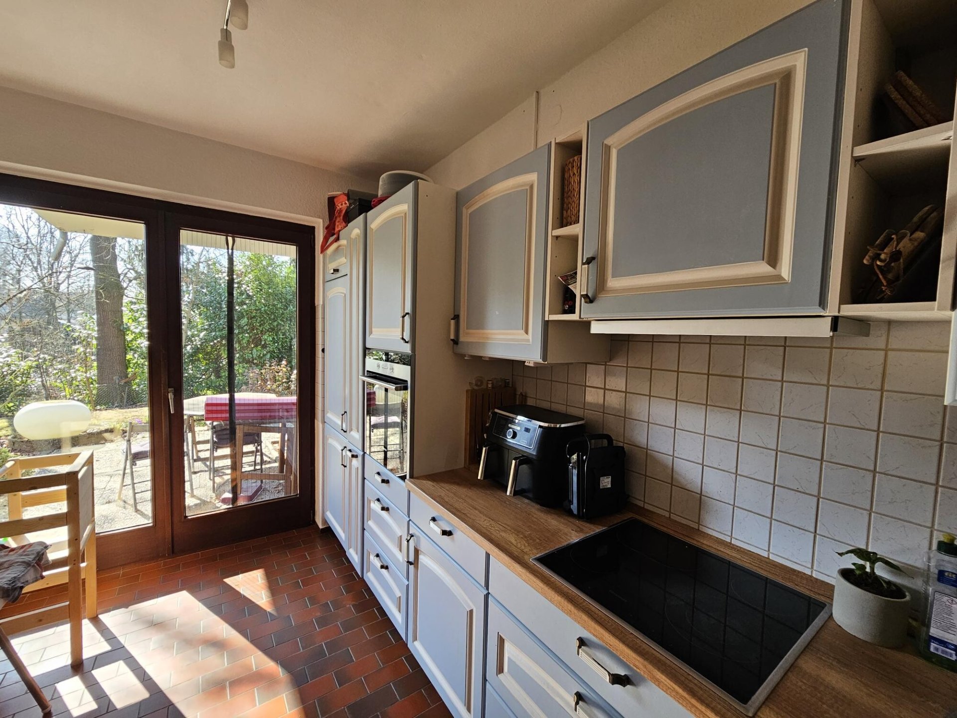 Die 3-Zimmerwohnung mit Terrasse liegt im Souterrain eines gepflegten Zweifamilienhauses. Einziehen und sich wohlfühlen heißt es bei dieser großzügig aufgeteilten Wohnung. Der Eingangsbereich verfügt über Marmorböden, die Wohn- und Schlafräume sind mit Laminat ausgestattet. Durch die großflächigen, doppelverglasten Holzfenster gelangt viel Tageslicht in die Räume.