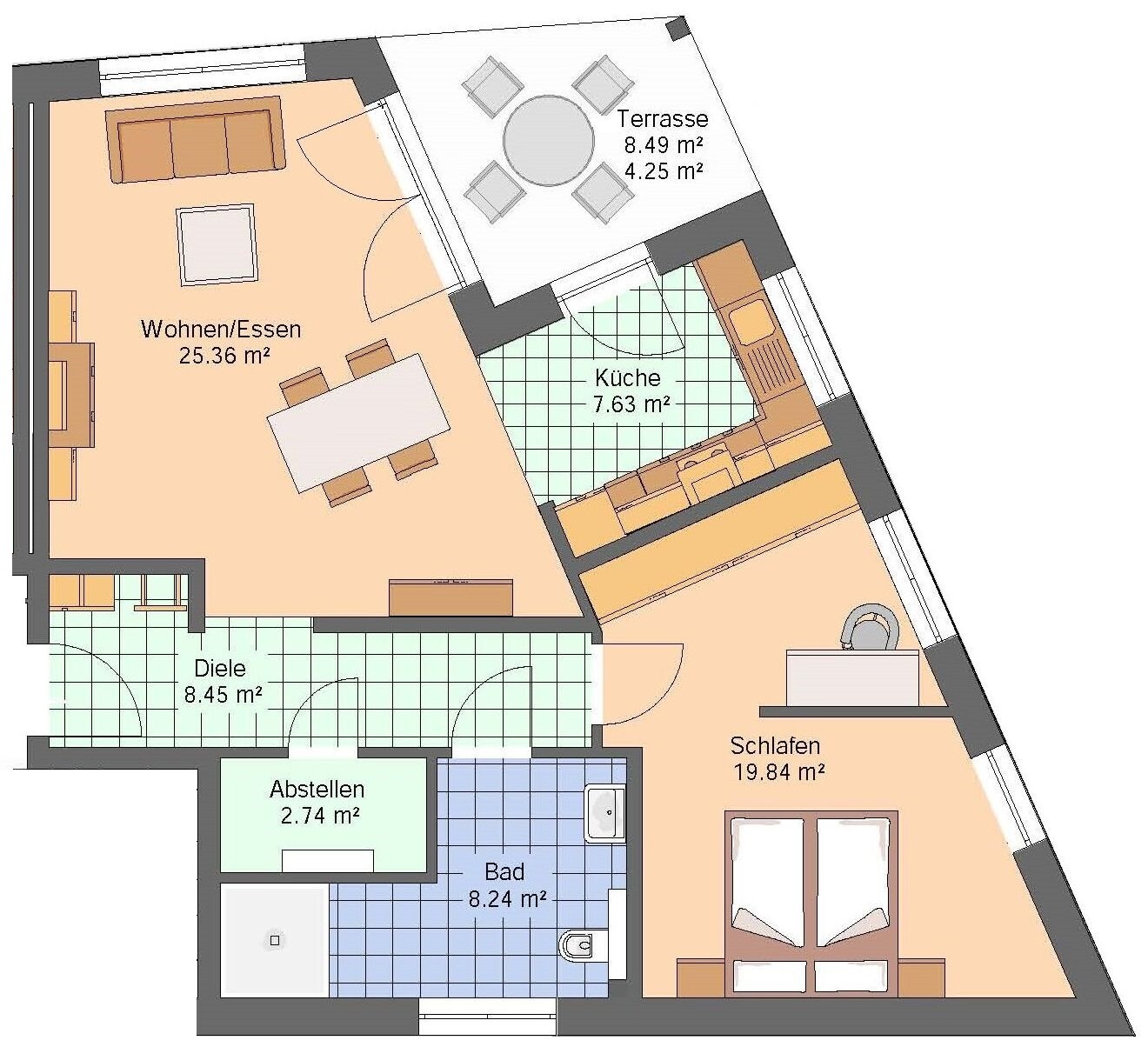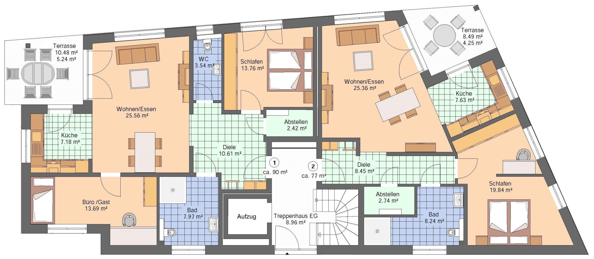 Hier präsentieren wir Ihnen eine 2-Zimmerwohnung auf ca. 77 m² Wohnfläche im Erdgeschoss mit einer überdachten Terrasse nach Nord-/Westen.