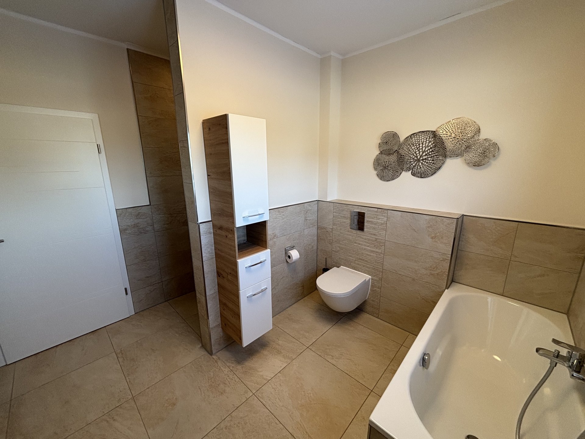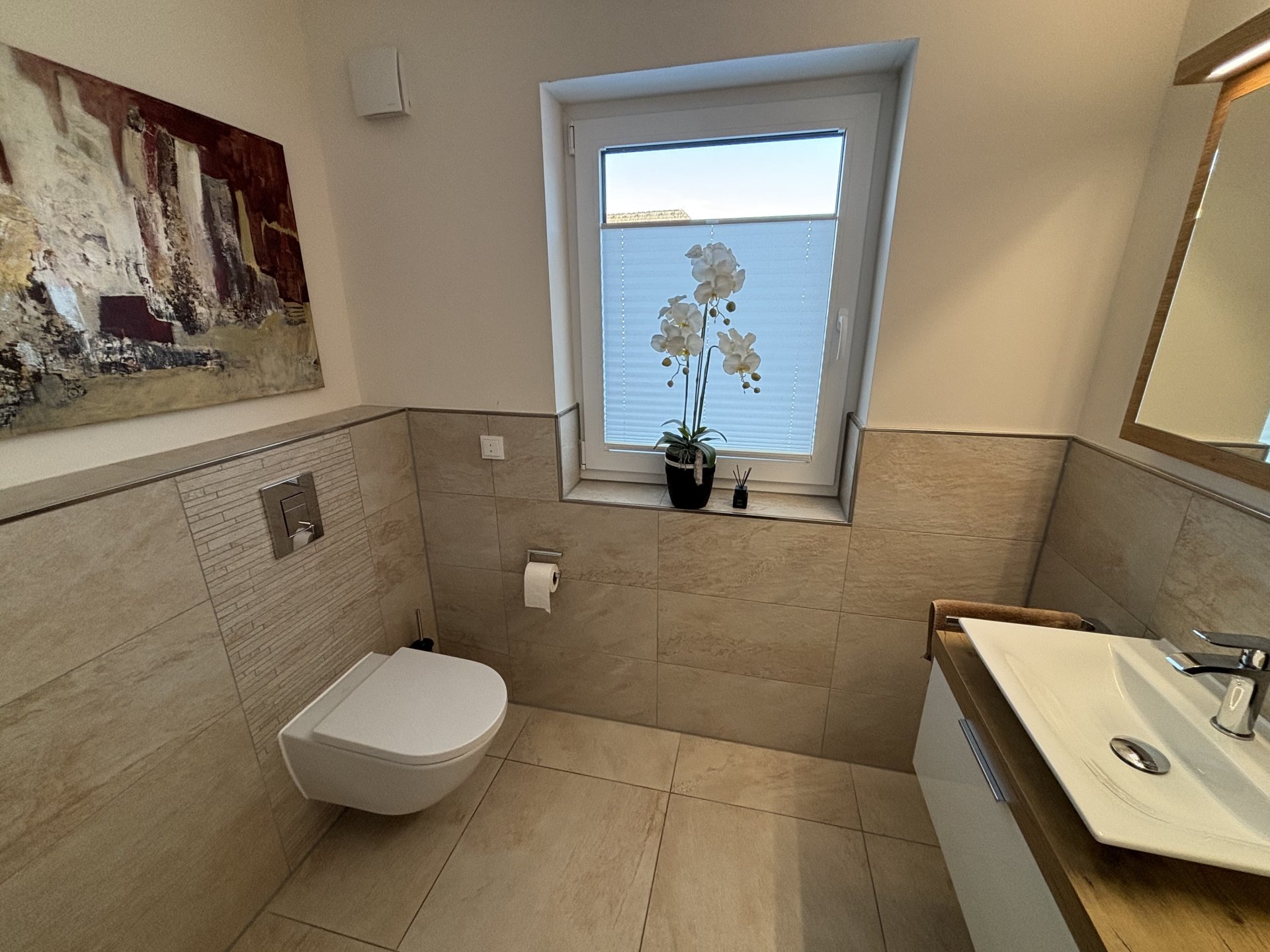 Im Obergeschoss befinden sich drei gut geschnittene Zimmer sowie ein modernes Bad mit bodengleicher Dusche und Badewanne - ideal für Familien oder Paare mit Anspruch.