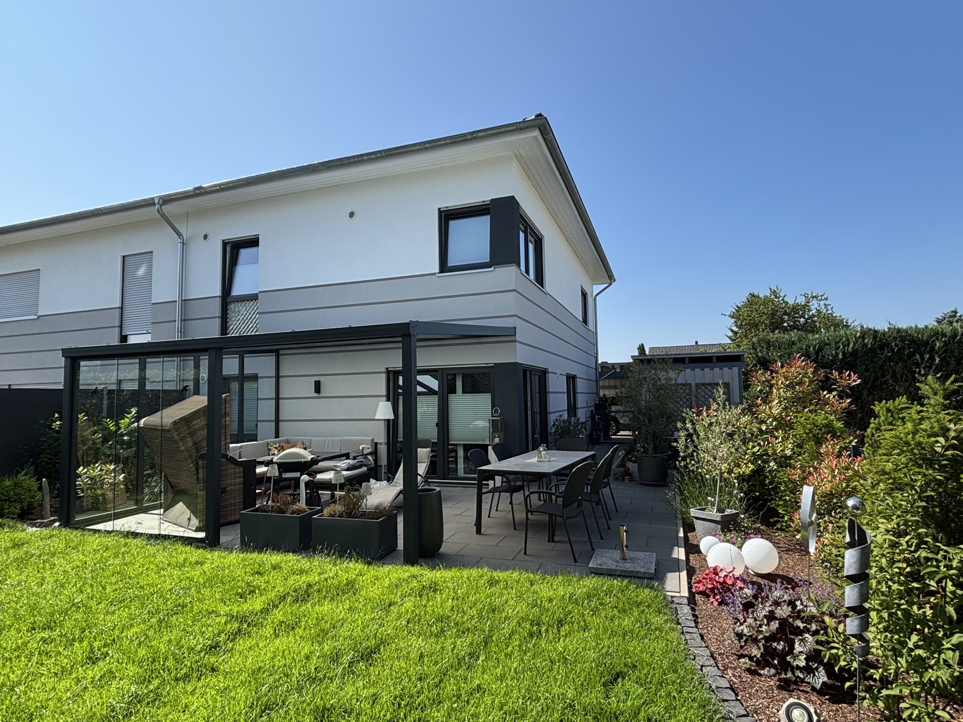Die in bewährter Schweneker-Qualität errichtete Doppelhaushälfte begeistert mit durchdachtem Grundriss, lichtdurchfluteten Räumen und hochwertiger Ausstattung. Durch die optimale Südausrichtung genießen Sie ganztägig Sonne auf der überdachten Terrasse und im gepflegten Garten.